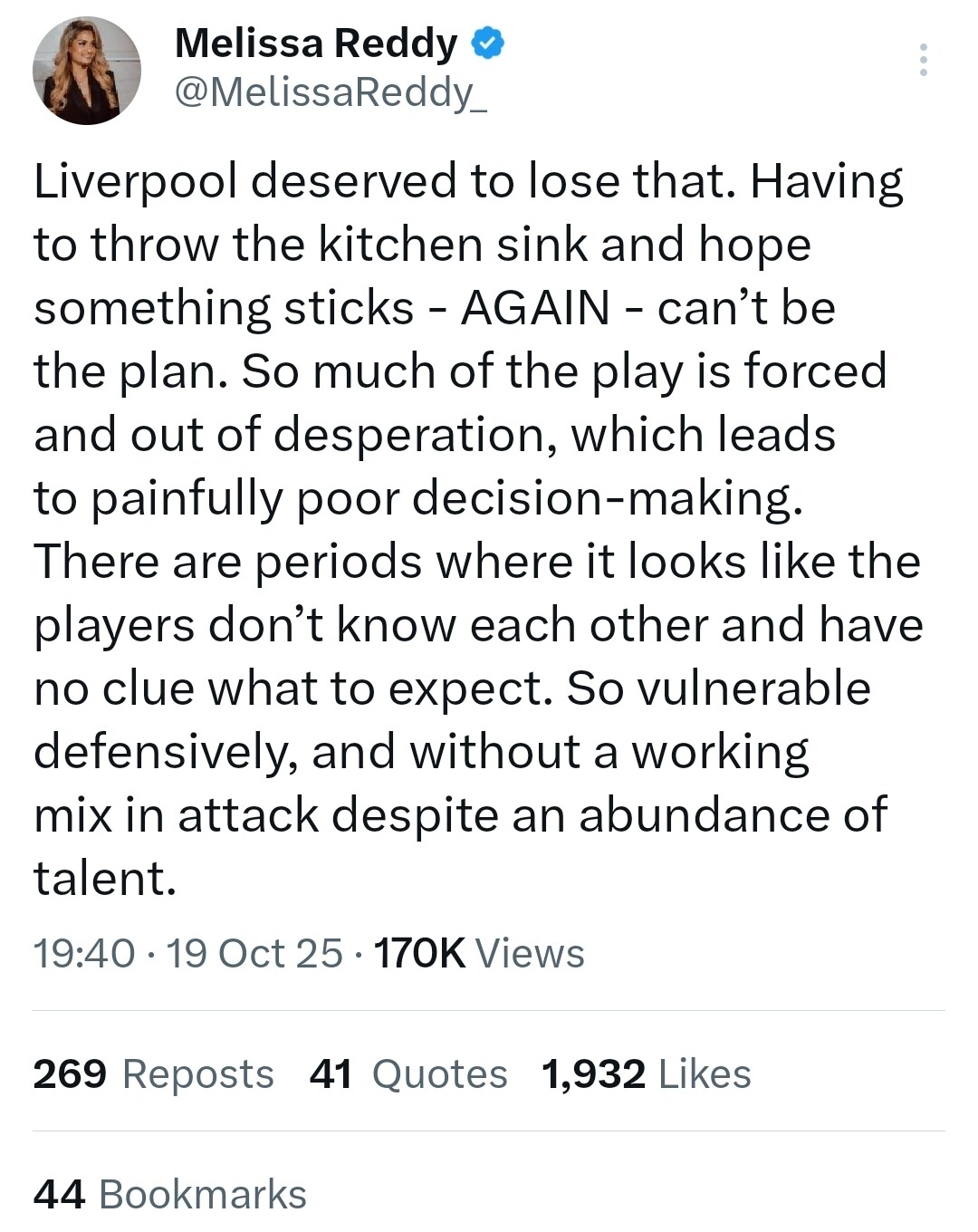 I don’t just blame Slot for this btw, the whole culture around the club needs looking at. It’s not like we were playing well up until the title was won, we’d been shite for a couple of months bar the odd half of football.