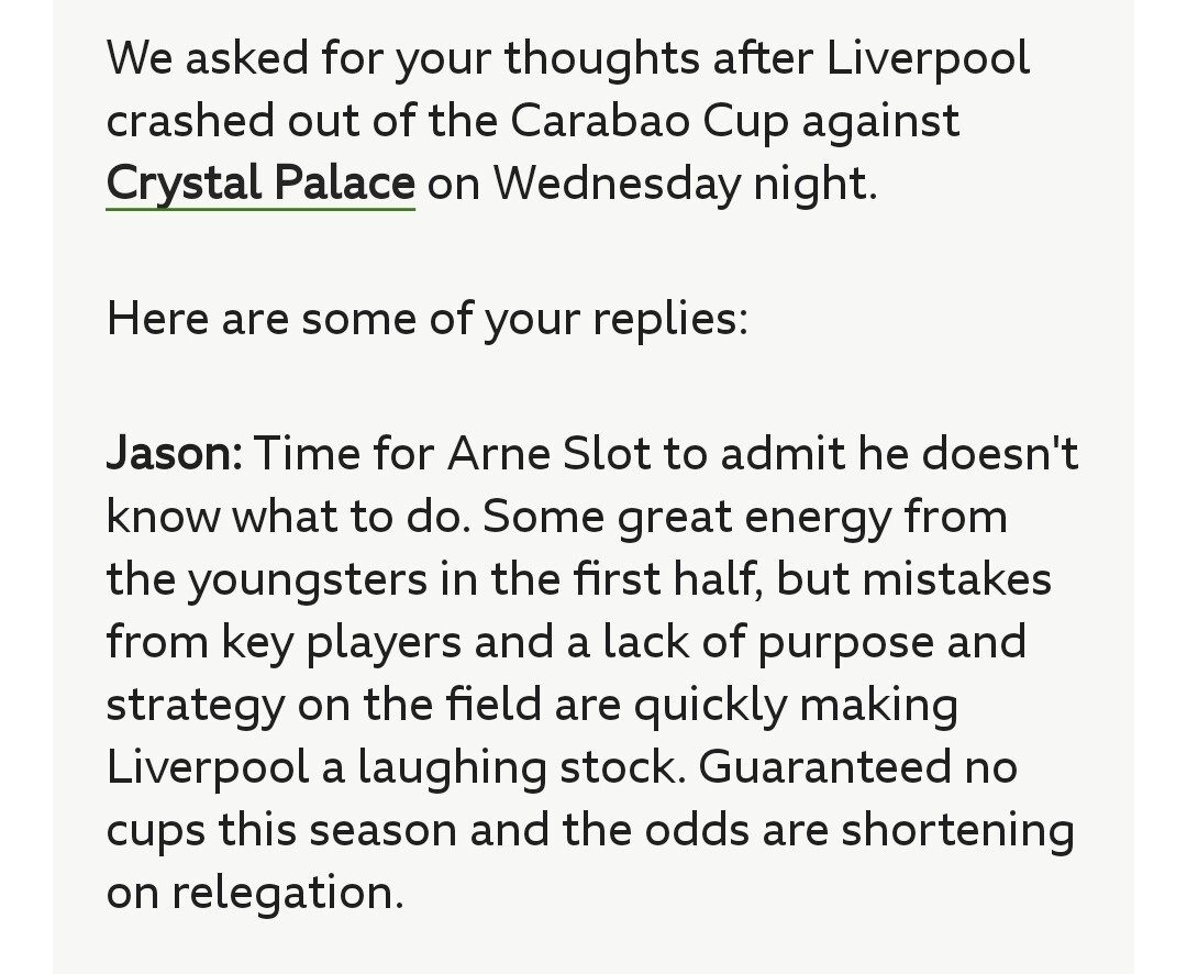 But cmon, a run of a few losses is all it takes for us to turn on a title winning manager? Shudders if it had happened to Klopp. We are very happy to disregard all the factors of new players trying to blend in and losing a great player in Jota unfortunately. We can say Slot should have anticipate this. Yes he should indeed but to demand that he be sacked because he had not gotten it right within the first 9 games of the league is ridiculous.