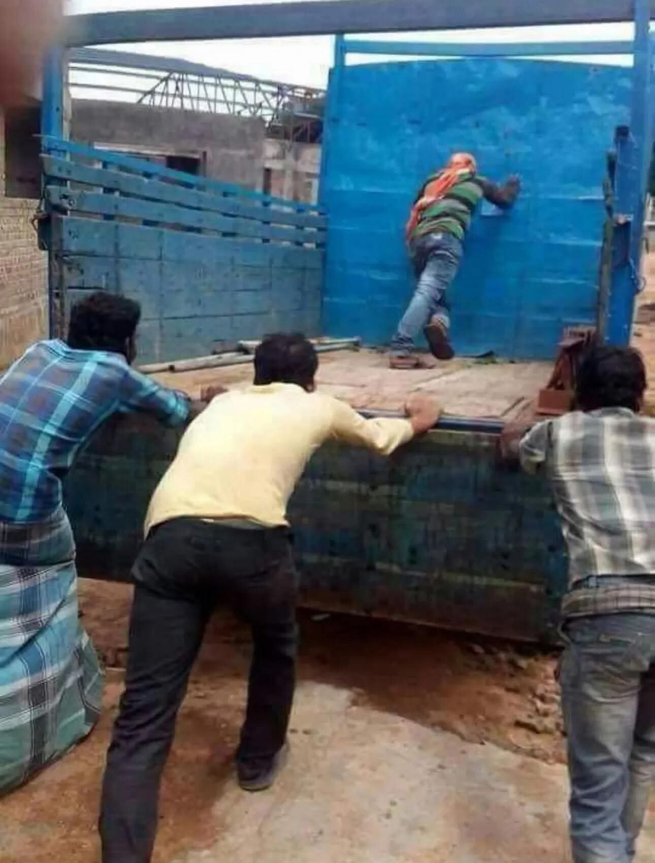 This is what the team is doing right now. Except the three blokes actually pushing the truck or not there.