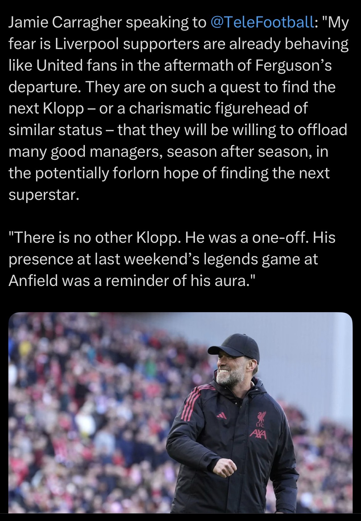 Carra talks some shite but I think this is a fair point. I still need to come to terms with the fact that we might never have another period where I enjoy watching Liverpool as much as under the Klopp years
