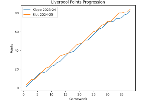 Klopp had multiple seasons where Liverpool hit 90+ points in a stronger league context. Hitting 84 points, was a fantastic achievement, but in most seasons you would not even guarantee second. So, I don’t see a step-change in level, more a maintenance of an already high baseline.