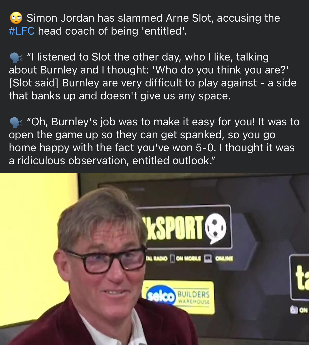 Slot was spot on. He is respectful and honest in his observations on the game. It should be a dream for a pundit. Instead, Simon Jordan is trying to twist it and say Slot is entitled. What a joker. Slot is about as far from that as can be. He is humble, hard working, and respectful.