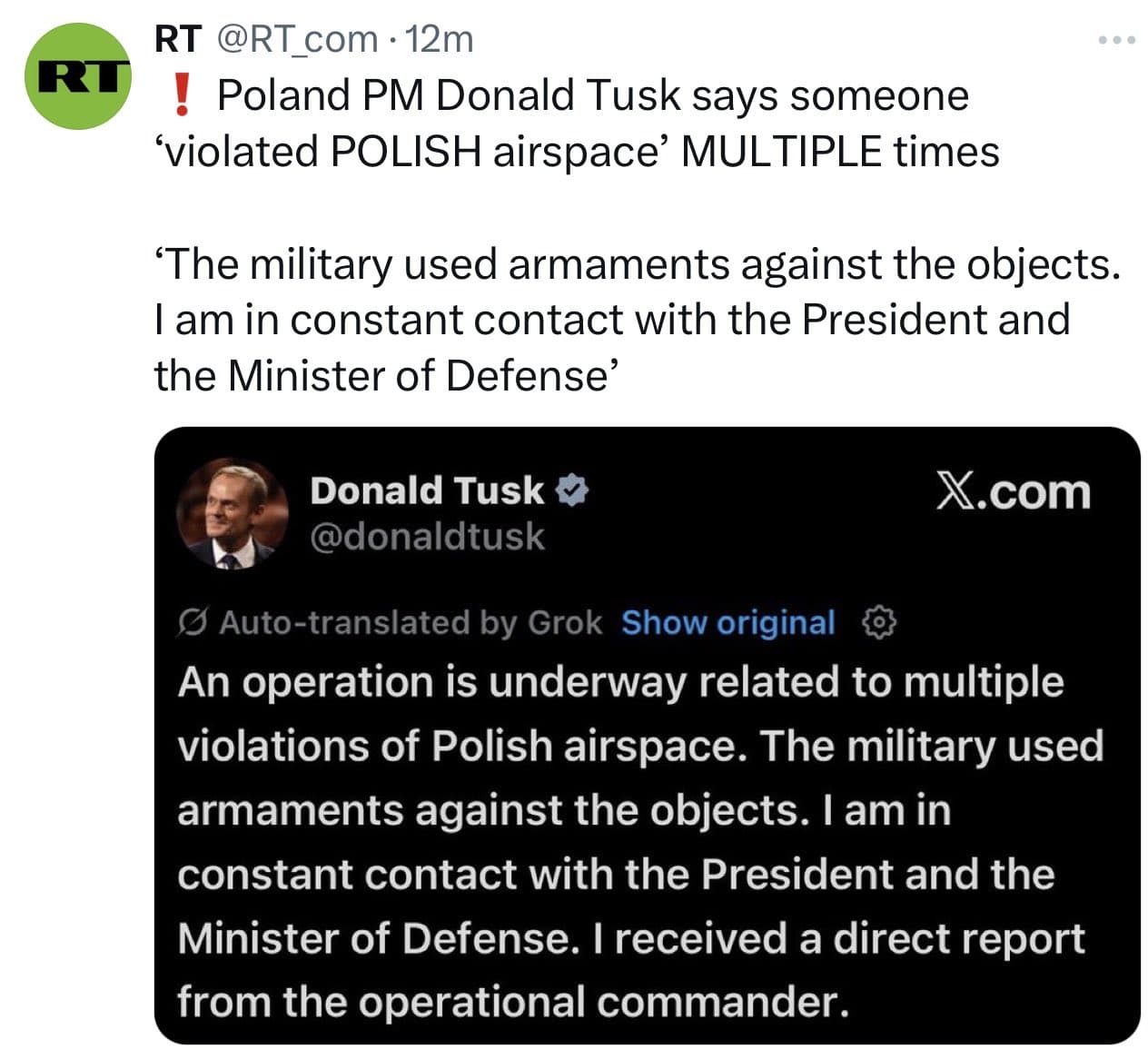 They are up now, the government An operation is underway related to multiple violations of Polish airspace. The military used armaments against the objects. I am in constant contact with the President and the Minister of Defense. I received a direct report from the operational commander. https://x.com/donaldtusk/status/1965600876925764069