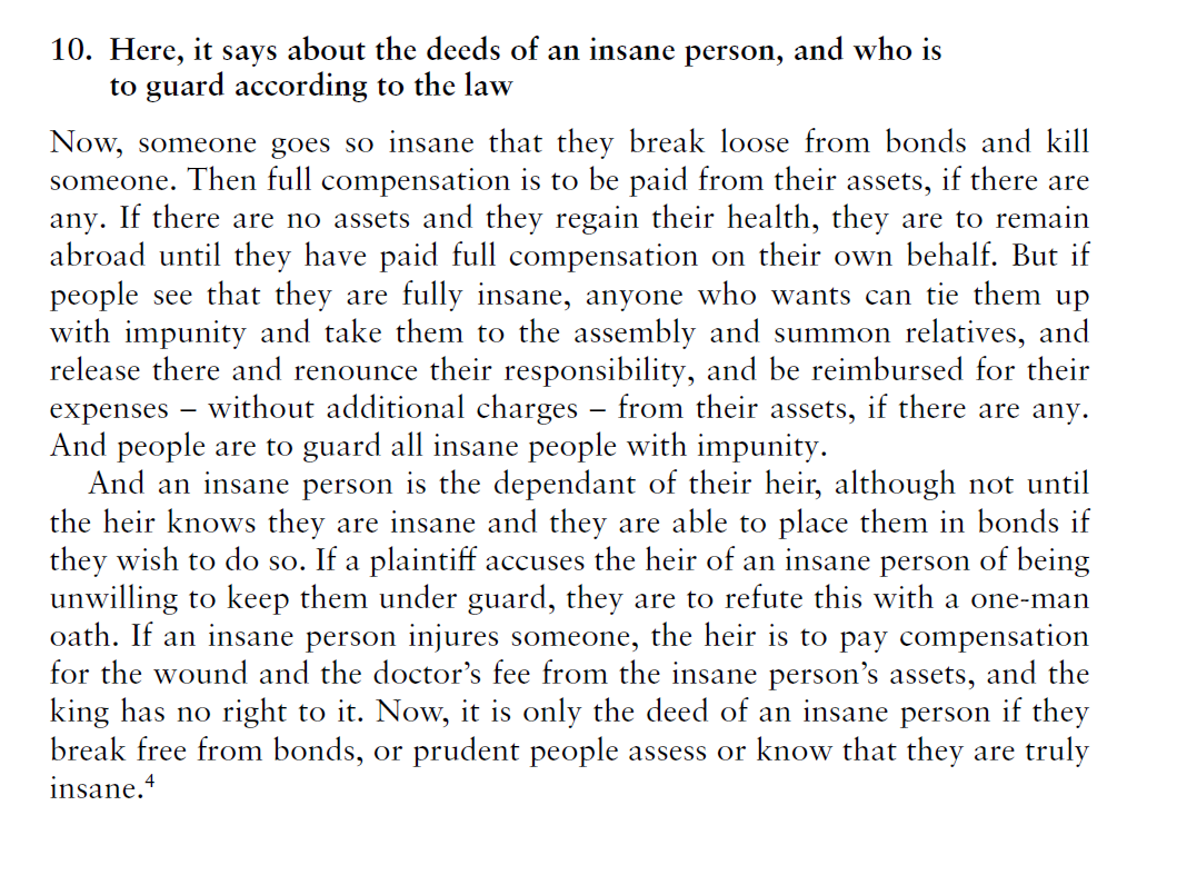 Regarding Mental Illness, this is the bit on someone insane murdering someone in 1274, from Magnus Lawgiver’s Laws of the Land from 1274
