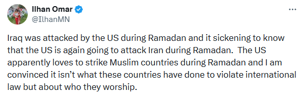 Well tell that to politicians like my ex President and Ilhan Omar. This war is reckless, ridiculous and illegal, further fueled by an American criminal’s ego. More innocent people are going to die. But then to frame this war as against Islam is just going to elevate this war to another level.