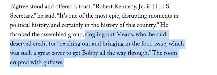 This is from a piece in the New Yorker by Claire Mallone about one of MAHA’s most prominent influencers, here she points out that those at the head of MAHA know the food stuff is just cleaning their image to give them cover to go after the vaccines