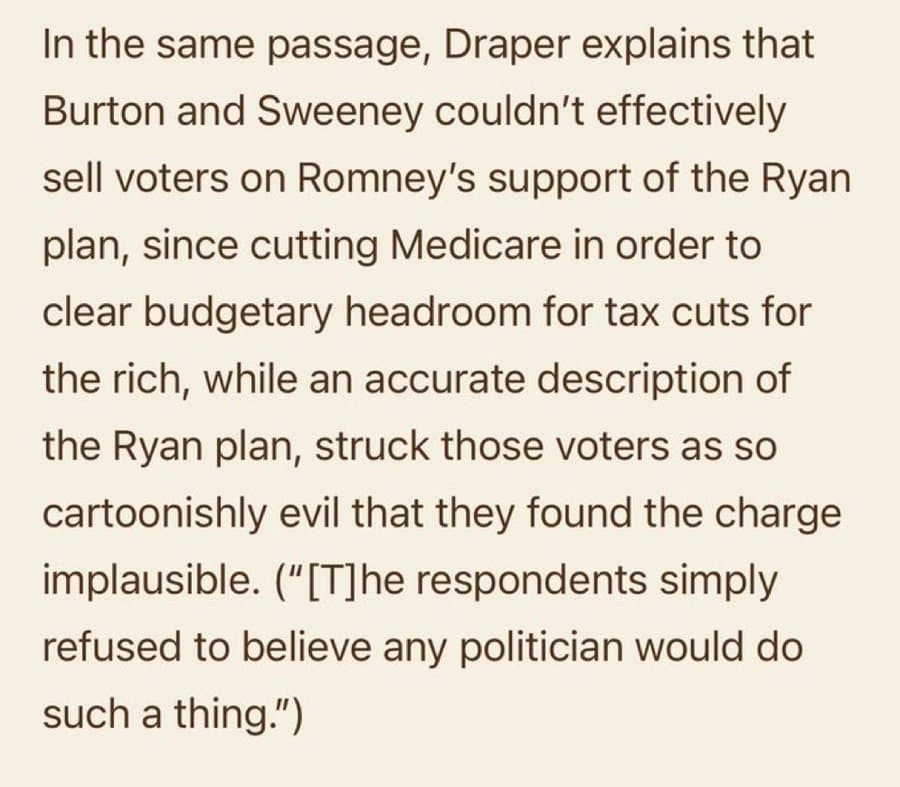 This is from Dem strategists from the 2012 campaign. The point being made is that they struggled to find the right angle to hit Romney with on his economic policy because an accurate description of what he intended to do normal people refused to accept it was real because it was too ghoulish a thing to try to do.