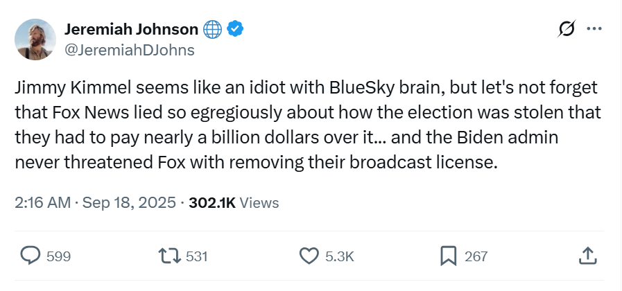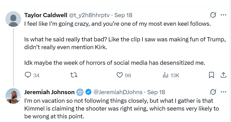 We should not be surprised, but it’s incredible how few people involved in the discourse know what it is Kimmel actually said and just accept as an article of faith that is was worthy of condemnation. Even liberals are quick to just accept that before pivoting to a first amendment defense. Fuck that, we should not even accept their framing because that is actually part of the fight, arguably the more important part. See this…