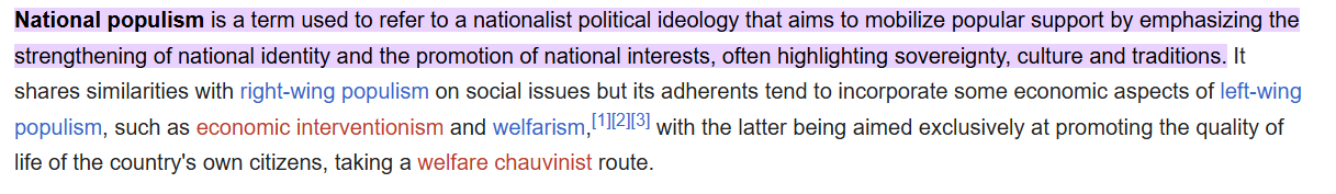 As for what the ideology is, I would suggest National Populism would be the closest. Not a perfect match obviously: