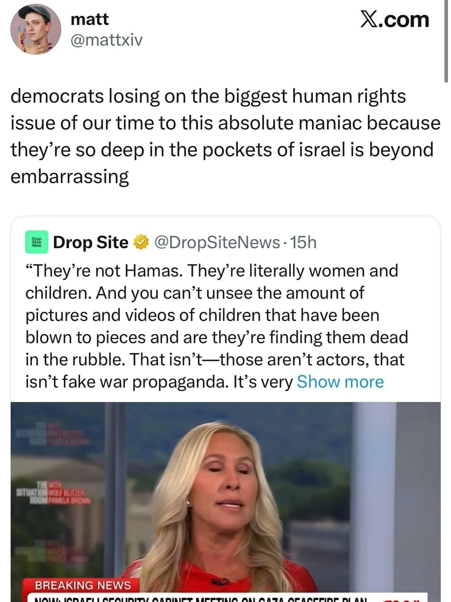 She literallly only says this because she is an absolute raging anti semite who belives in Jewish space laser conspircy theories. What she says is irrelevant since she has no empathy for Palestinians other than itās the Jews that are doing it.