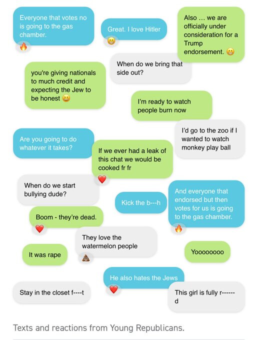 Politico have got access to a group chat among leaders of various Young Republican groups. I get they will say they were jokes made in private and dont reflect their real opinions, but when you live so much of your life so far over any reasonable line there is no way it doesnt become, at least a little, a part of who you actually are. This is the perfect illustration of the 4Chanisifcation of the right…and even more why normies have tracked right because if this is what young people are exposed to outside of politics, and then this starts becoming our politics…as Vonnegut said - we are what we pretend to be