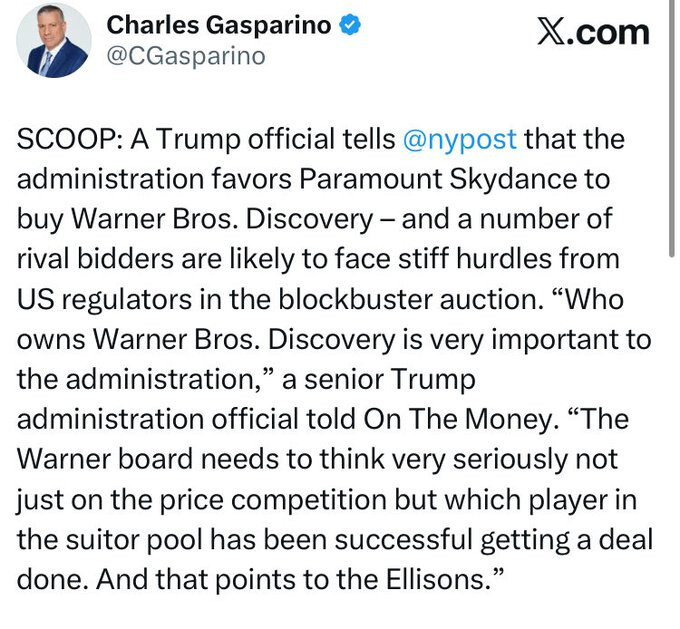 Lots will see this as being about getting a more friendly person in at CNN, but the Discovery acquisition already did that as an old school Sinclair guy has basically been overseeing that), but I think it’s just more the payback to Ellison for what he’s already done to CBS. And he fucking hates the guy who runs Comcast (because of MSNBC). Either way, the corruption at play is absolutely staggering.