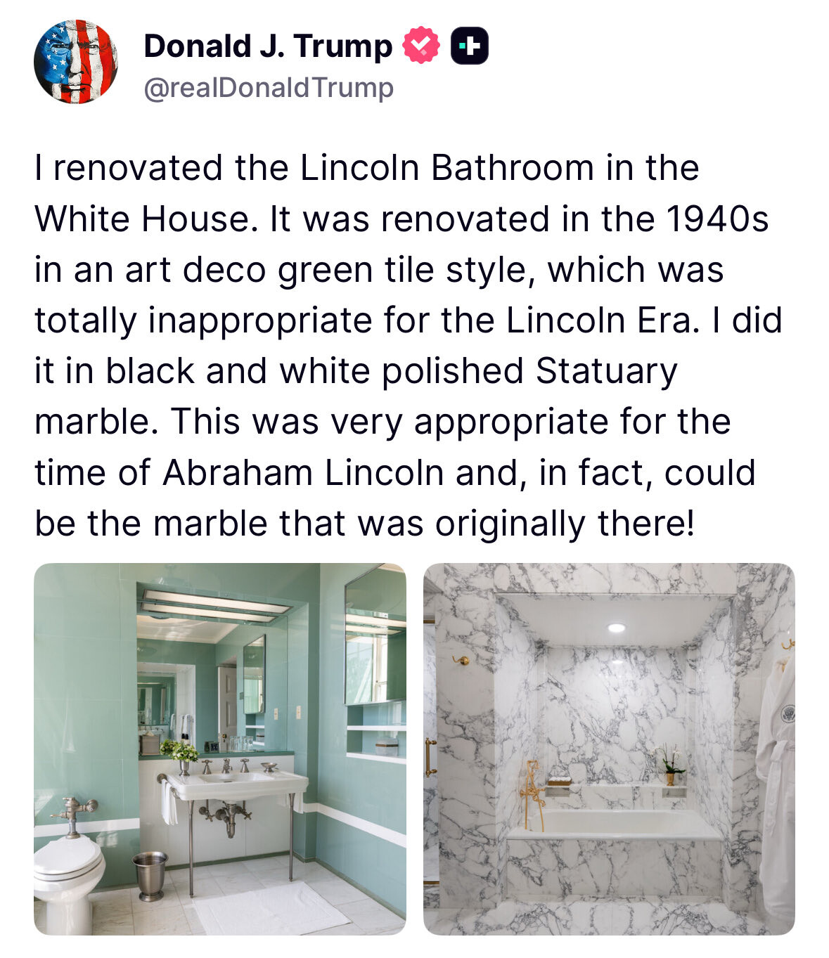 My GOD, there is a reason why there is so little history and culture in the US. That is…obscene ! That one to the left, so tasteful and elegant with a historical flair. Trump’s thing is nouveau riche and could be Lukashenko’s or Prigozhin’s bathroom.