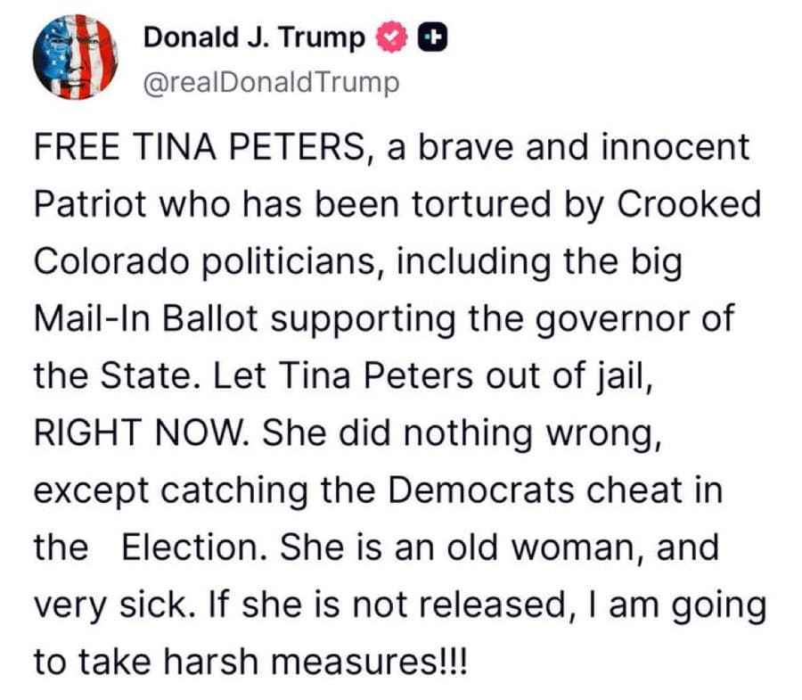 Tina Peters was convicted for giving unauthorized people access to the CO voting machines she was overseeing, leaking data from the machines (to insinuating abnormalities), and obstructing the investigation of it, and was subject to scathing criticism by the judge in the case over her lack of remorse.