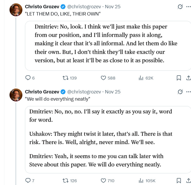 Kushner was with Witkoff when Dmitriev flew to Miami , a couple of days before the second leaked call between Ushakov and Dmitriev. Like the billions he’s seen flow his way from getting the Saudis to go along with the Gaza peace plan , I find it hard not to believe that there’s a similar incentive at work here , Dmitriev after all is the head of the Russian Direct Investment Fund and there has been plenty of reporting suggesting that the Russians know the best way to manipulate Trump is to make equally vague and lucrative promises of trade deals just like Bonesaw has.