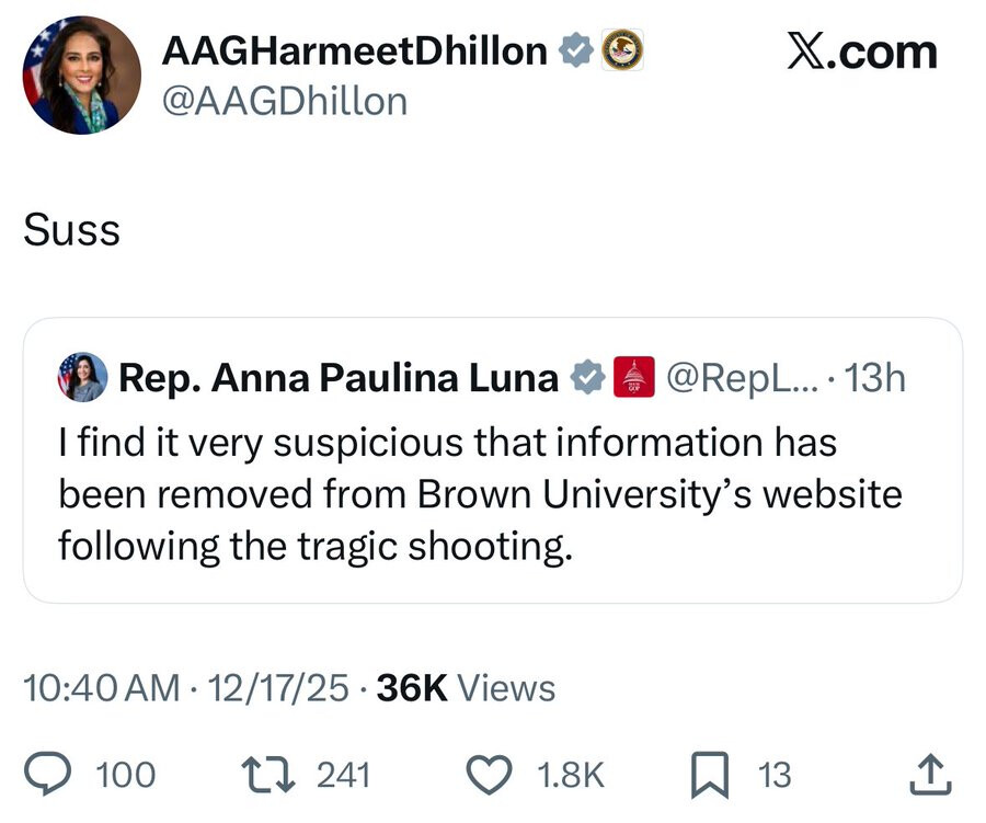 After the Brown University shooting on the weekend the online right somehow decided some random muslim student was responsible for it and started doxing him. To help protect him the university started scrubbing whatever mentions of him there were on official university websites. The same online right who had already accused him of the shooting interpreted that as Brown trying to distance themselves from having had a mass murderer enrolled. Totally fucking insane stuff