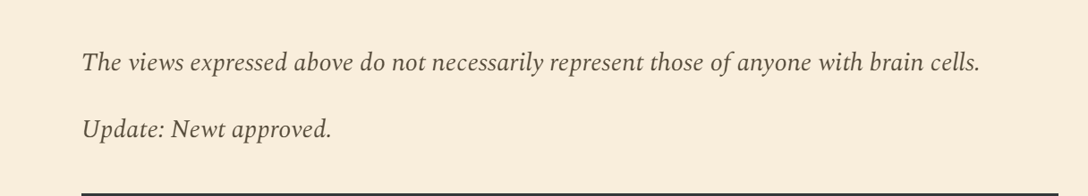 The Substack article Newt has used here is satirical. It originally ended with this statement shown below that had to be amended once the writer realized Newt took it seriously
