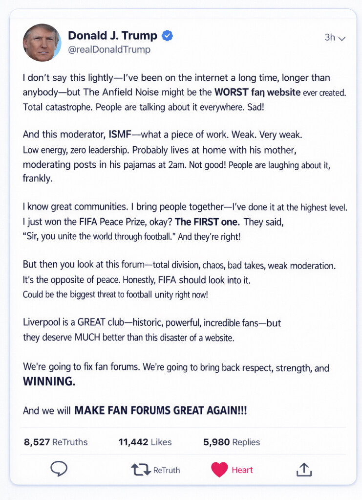 Calling yourself that on a Liverpool website, the state of you. Many sites have rules that donāt allow new posters to post in more controversial areas before theyāve made 100 posts etc and garnered a reputation. Why the fuck would you come on a Liverpool site to start by posting that shite? You are very close to being the first poster Iāve ever blocked and - I say this with the upmost respect - I hope you just fuck off.