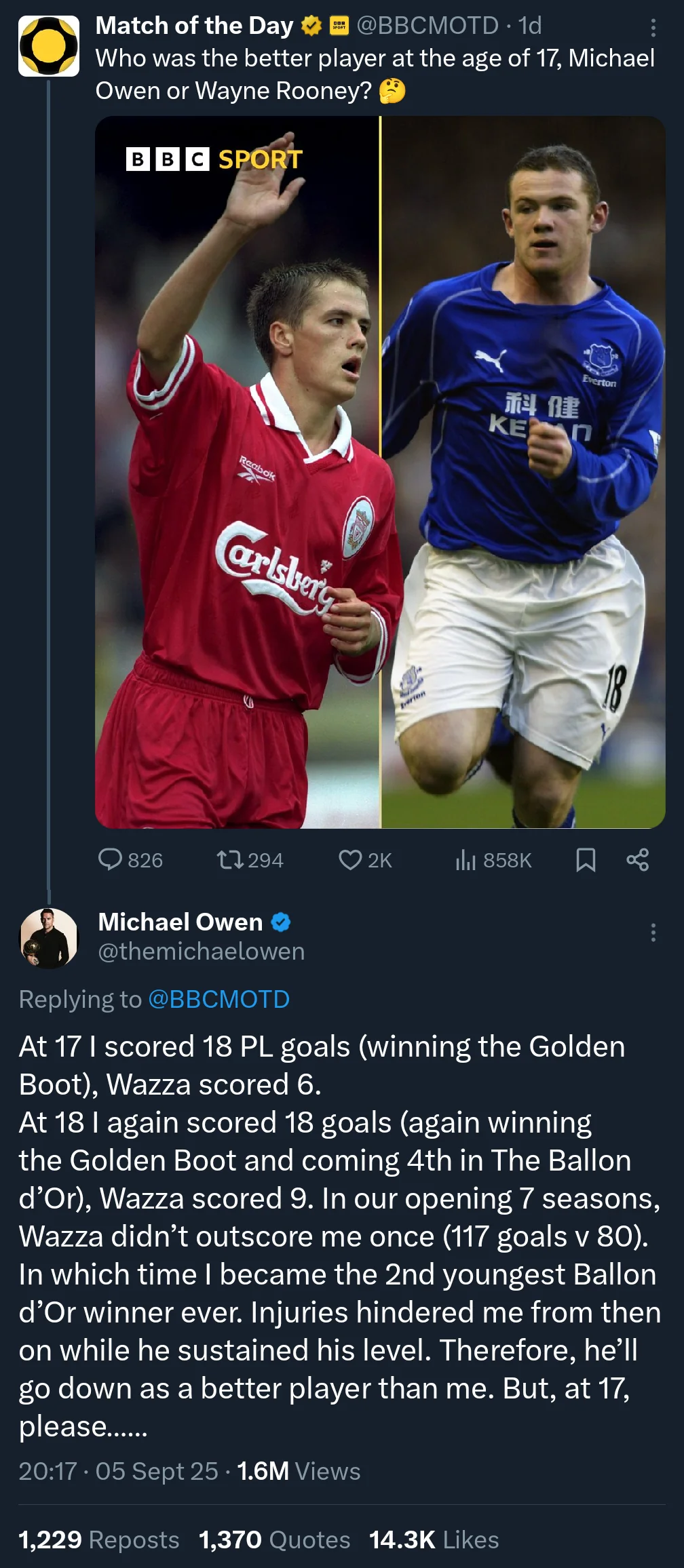 Rooney is obviously the far greater player. But Owen was miles above when comparing their achievements when they were both 17/18.