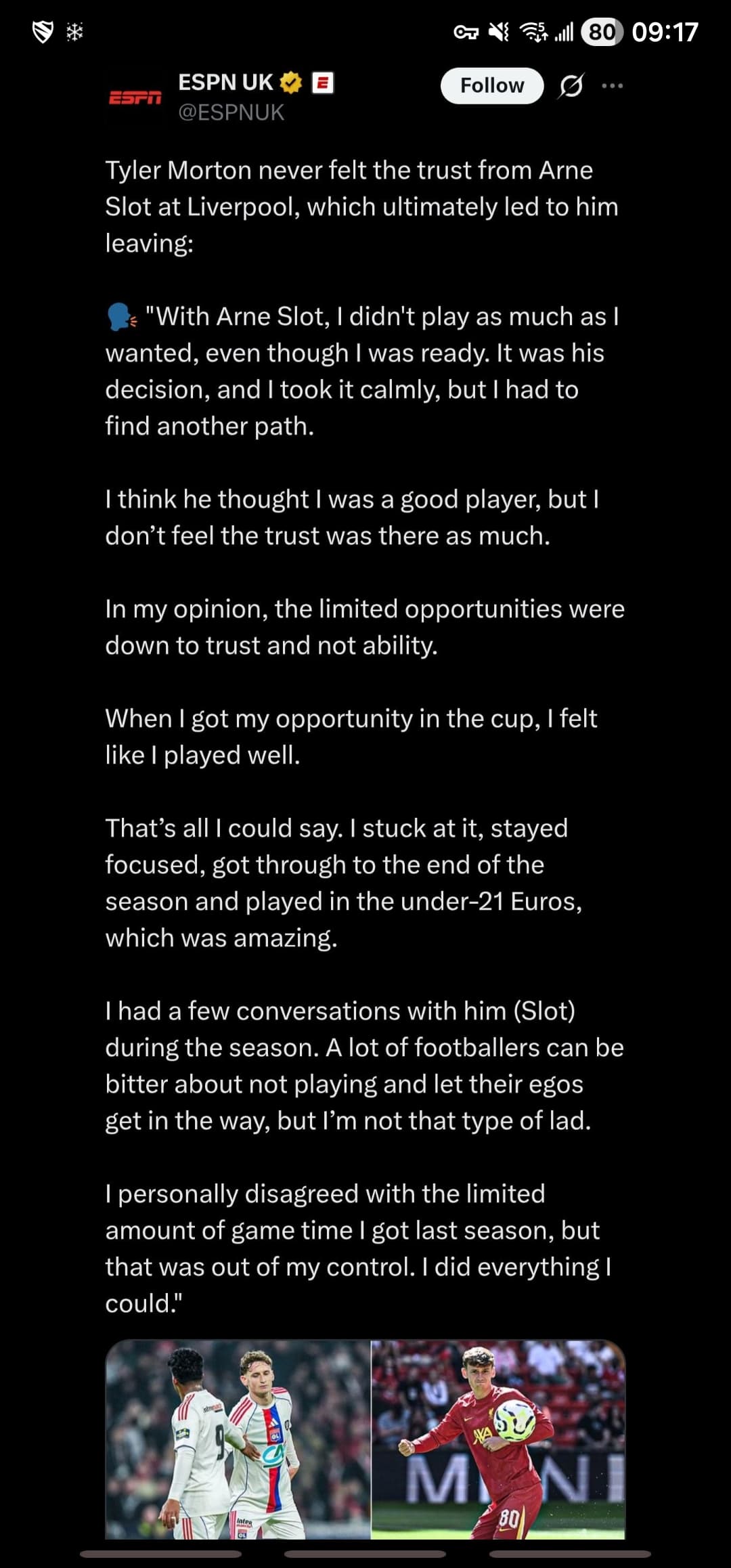 An ex-player saying the Slot’s “trust” issue. If it’s under other circumstances, I would have just brushed it off about an ex not particularly happy that he got casted off (also there are some on here do not believe Morton to be a starter here anyway)…However, the evidences are in front of us on Slot favouritism in the guise of trust. Jarell Quansah didn’t even want to mention Slot’s name in one of his interview.