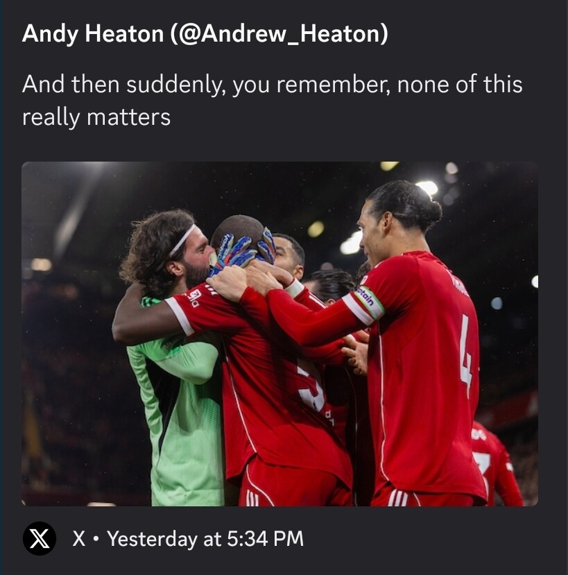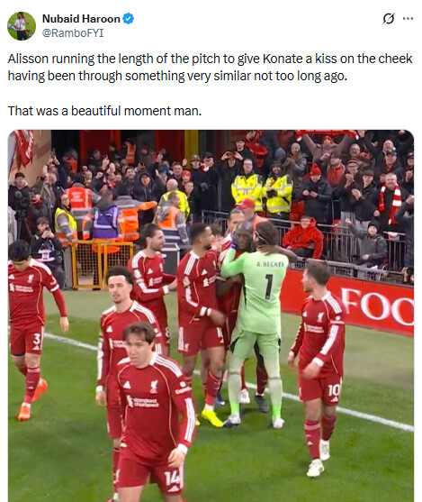 In this wretched season, marred with tragedies, the sight of Alisson running the length of the pitch to celebrate with and quite possibly console Konate… Well, that’s one of the reasons I love this club.