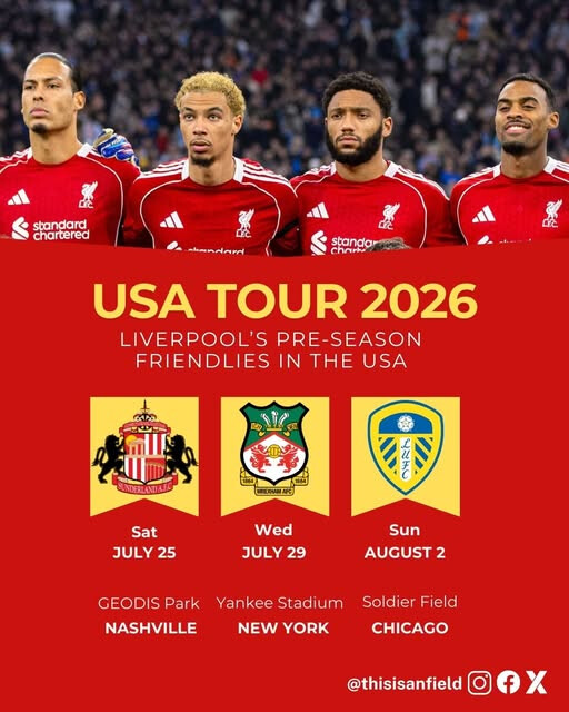 Nashville, New York and Chicago! Liverpool are off to the USA to face Sunderland, Wrexham and Leeds in pre-season