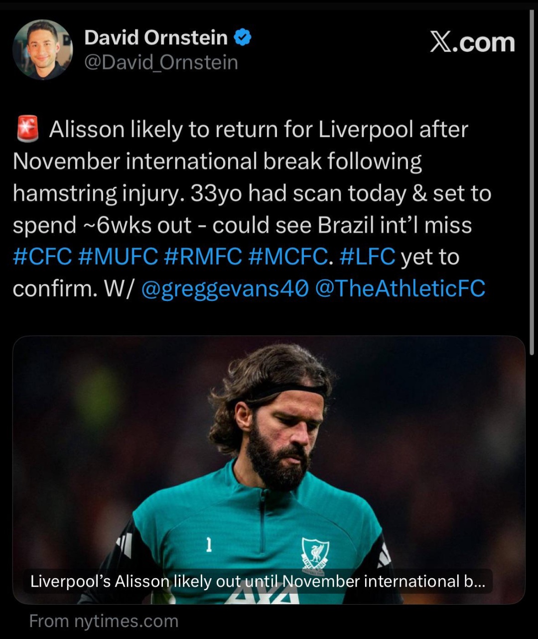 Slot: Curtis Jones to return to training tomorrow and expected to be available for the game vs Everton.