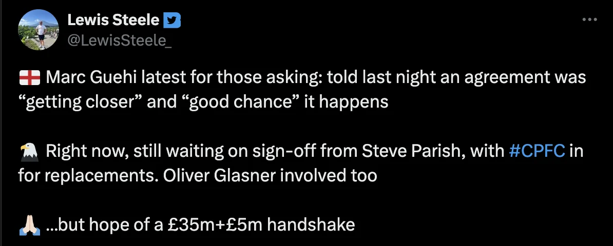 Some website by the name of football.london claims that Chelsea are trying to hijack our move for Guehi. As he is a former Chelsea player, I would not be surprised by this.