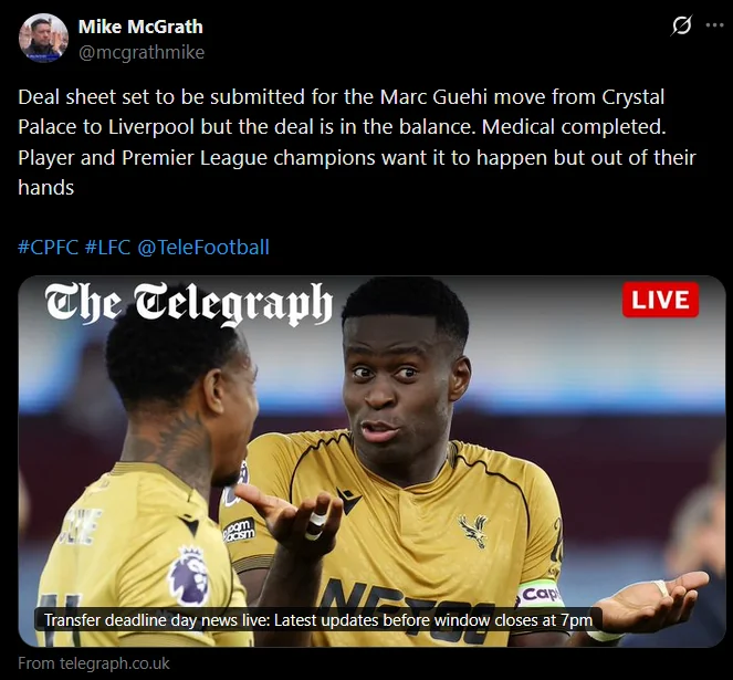 Deal sheet should be in i guess. We have 2 more hours if we submit the deal sheet between 5 pm and 7pm.We will get Guehi now. https://x.com/CPFC/status/1962576899571327437?t=Wt9nobSCyGFSdNO7pZjuiQ&s=19