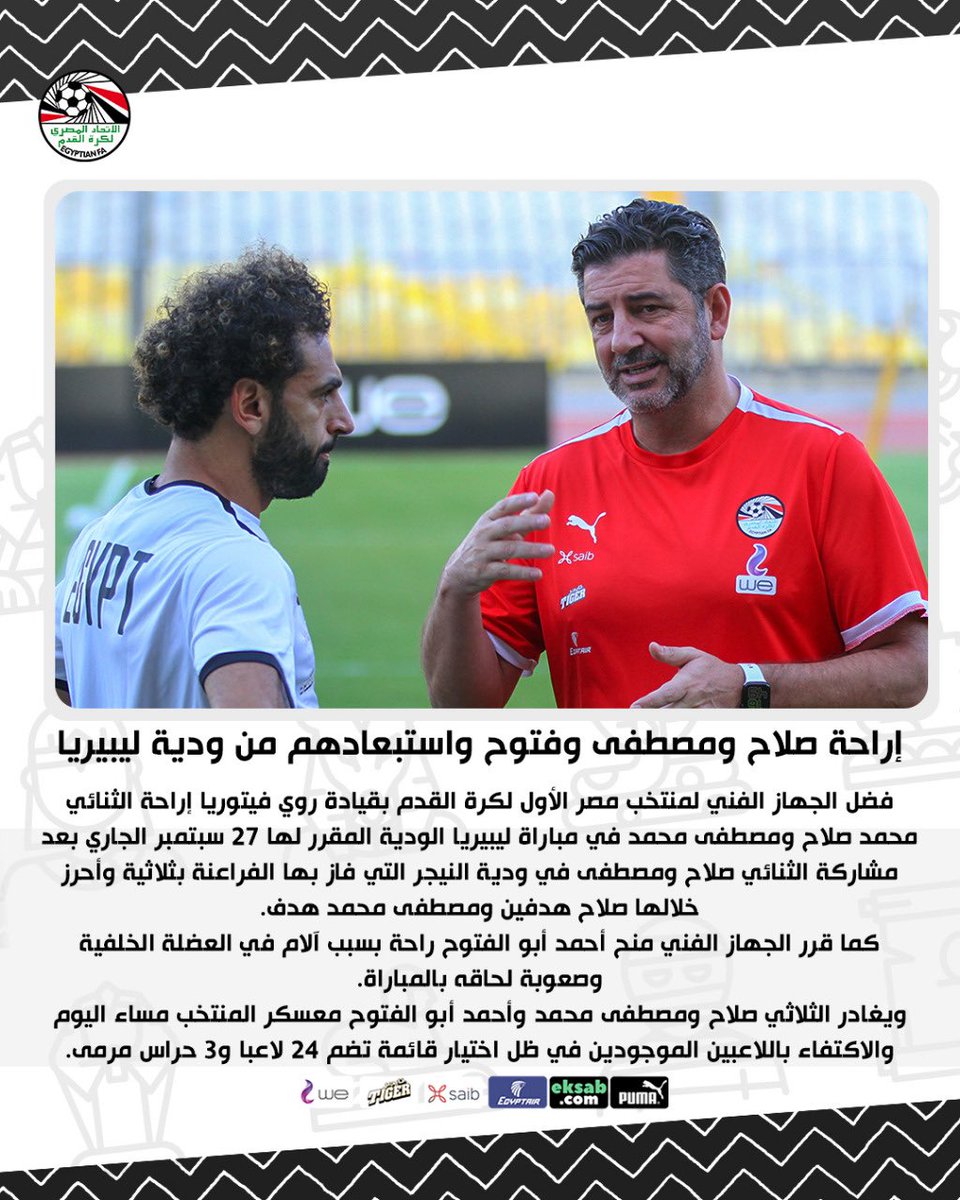 The technical staff of the Egyptian national football team, led by Roy Vitoria, preferred to rest the duo Mohamed Salah and Mustafa Mohamed in the Liberia friendly match scheduled for September 27, after the participation of Salah and Mustafa in the last friendly in Niger.