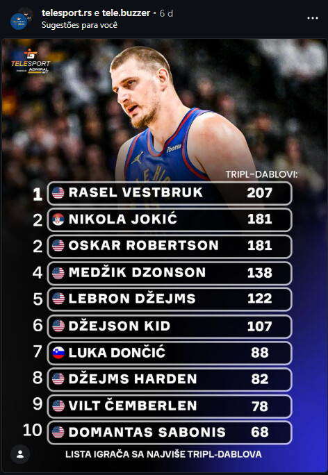 This is great. In celebration of Jokic equaling the big O’s tally of career triple doubles a Serbian website put up the list of current top 10s
