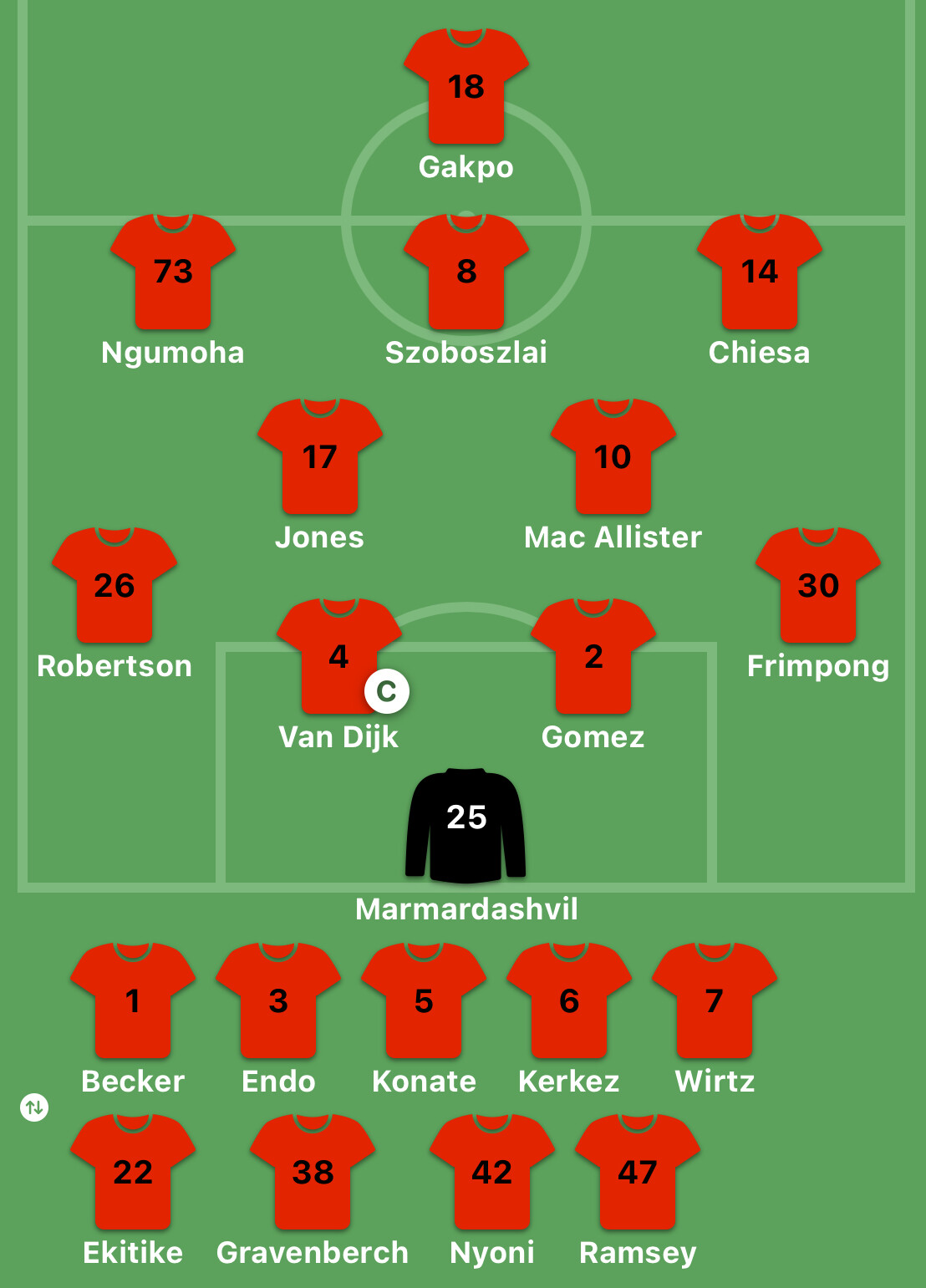 Unused subs: Alisson, Endo, Kerkez, Nyoni, Ramsey