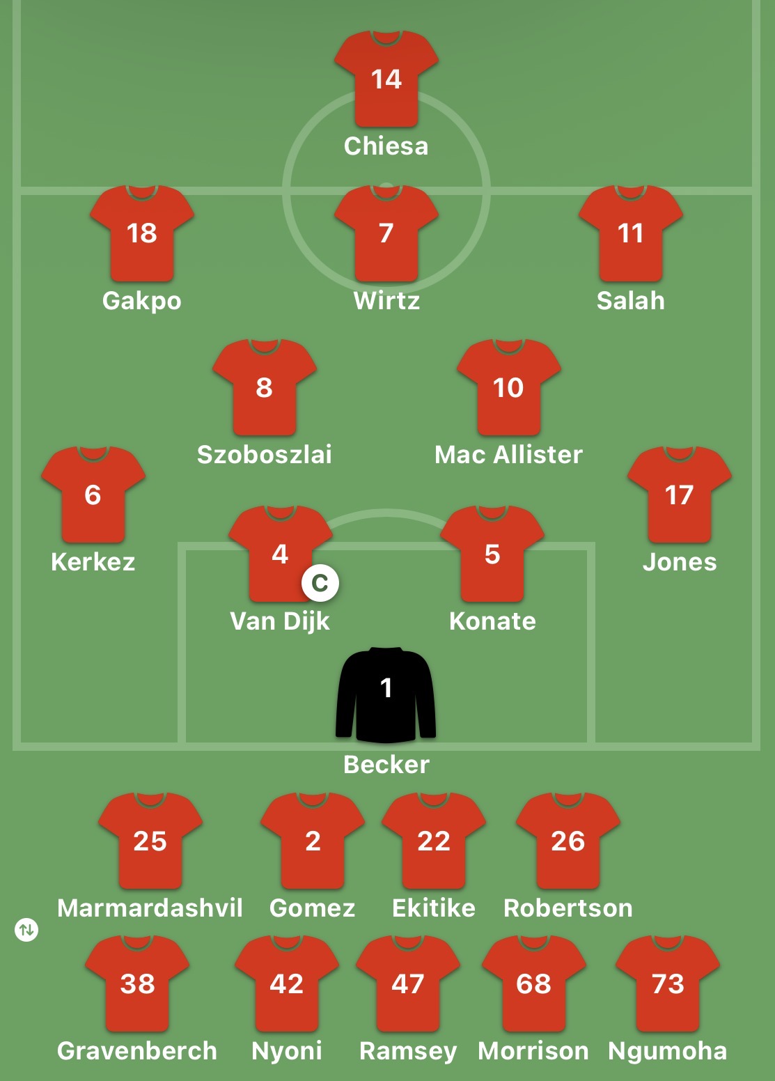 Unused subs: Mamardashvili, Robertson, Gravenberch, Morrison,