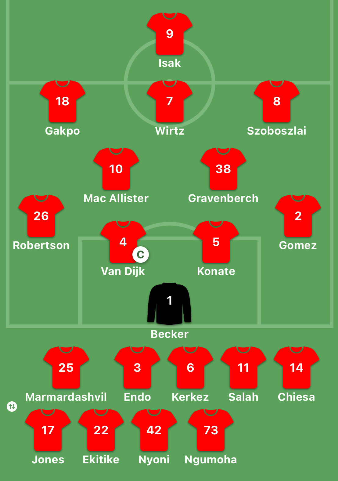 Unused subs: Mamardashvili, Endo, Ekitike, Nyoni, Ngumoha
