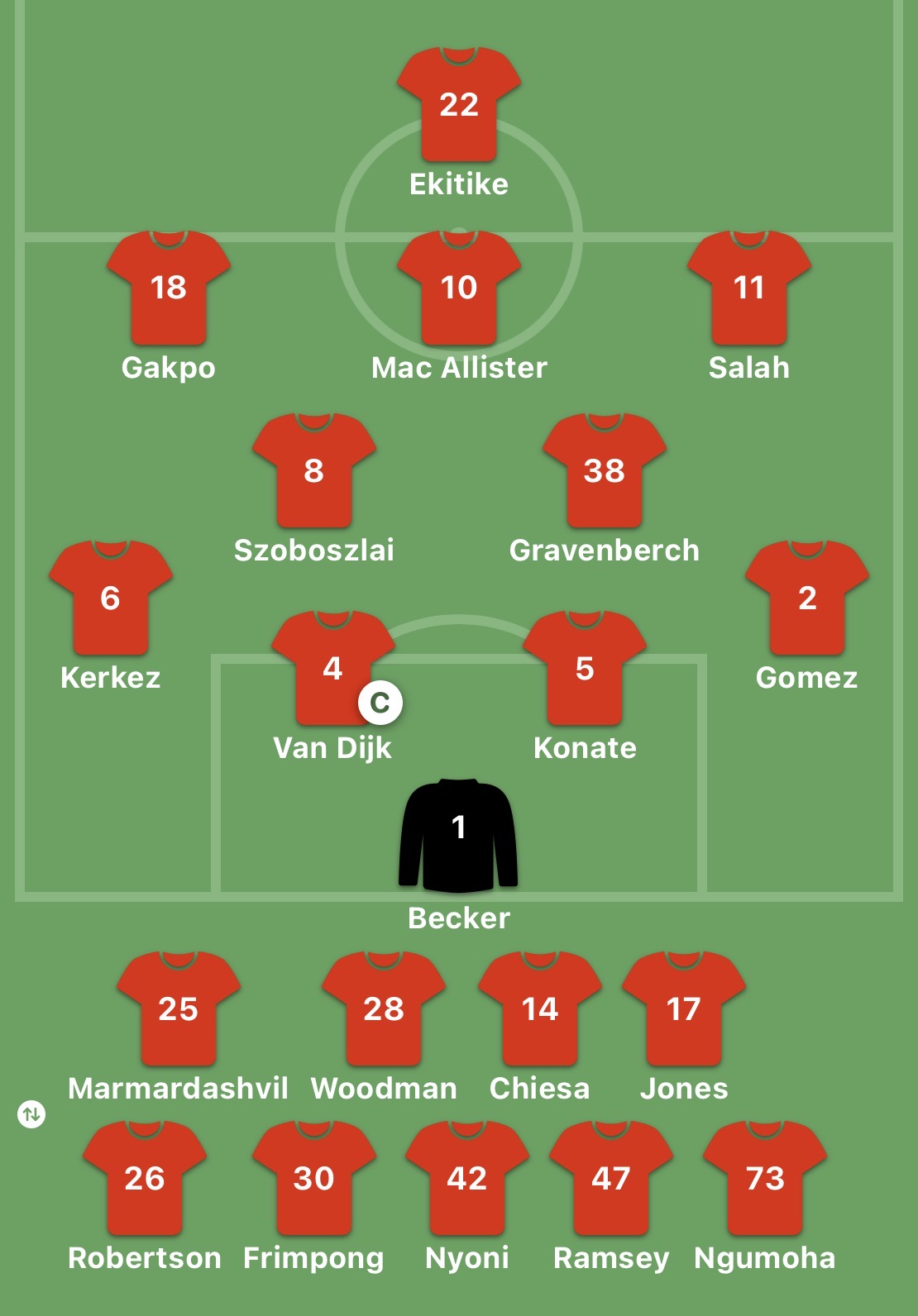 Unused subs: Mamardashvili, Woodman, Chiesa, Jones, Robertson, Ramsey,