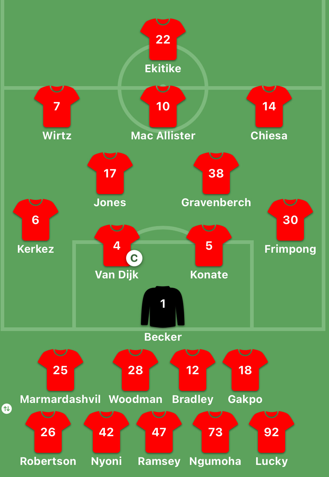 Unused subs: Mamardashvili, Woodman, Robertson, Ramsey, Ngumoha, Lucky