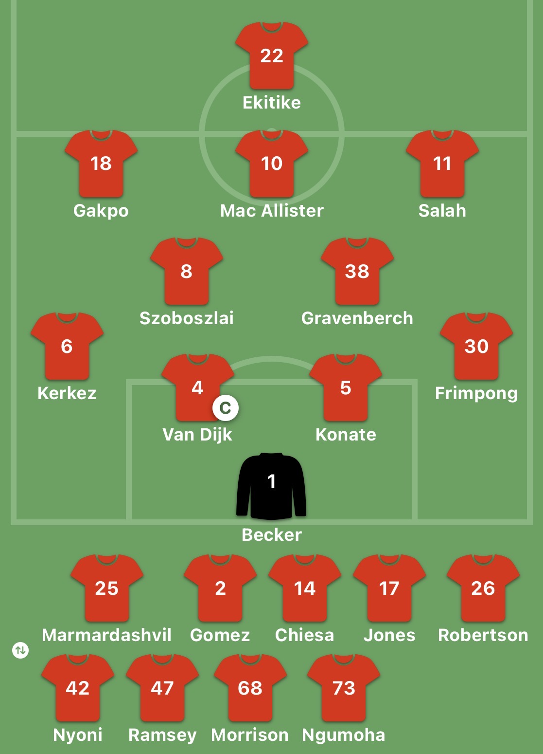 Unused subs: Mamardashvili, Gomez, Chiesa, Nyoni, Ramsey, Morrison,