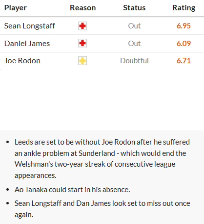 Rodon out is a big miss for Leeds at the back. He’s their lynchpin at the back