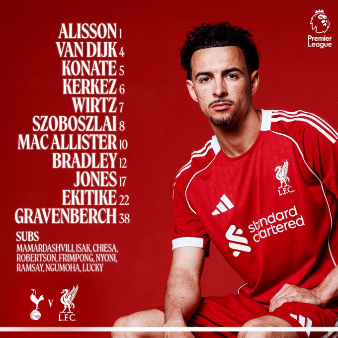 Liverpool: Alisson, Van Dijk, Konate, Kerkez, Wirtz, Szoboszlai, Mac Allister, Bradley, Jones, Ekitike, Gravenberch.