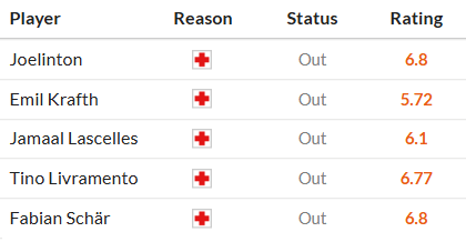Eddie Howe is without Joelinton, Fabian Schär, Tino Livramento, and Jamaal Lascelles, weakening both midfield depth and defensive continuity. A familiar 4-3-3 is expected, with Guimarães anchoring and Gordon operating from the left.