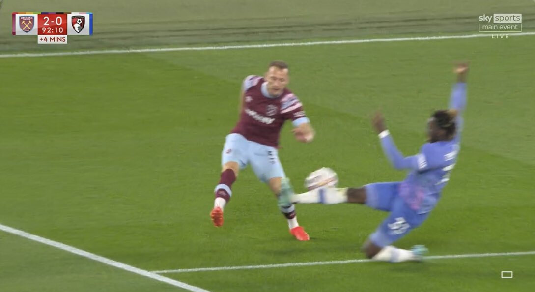 That is a bullshit penalty. Zemura could do nothing about that. He’s sliding naturally. And he’s too close to Coufal.