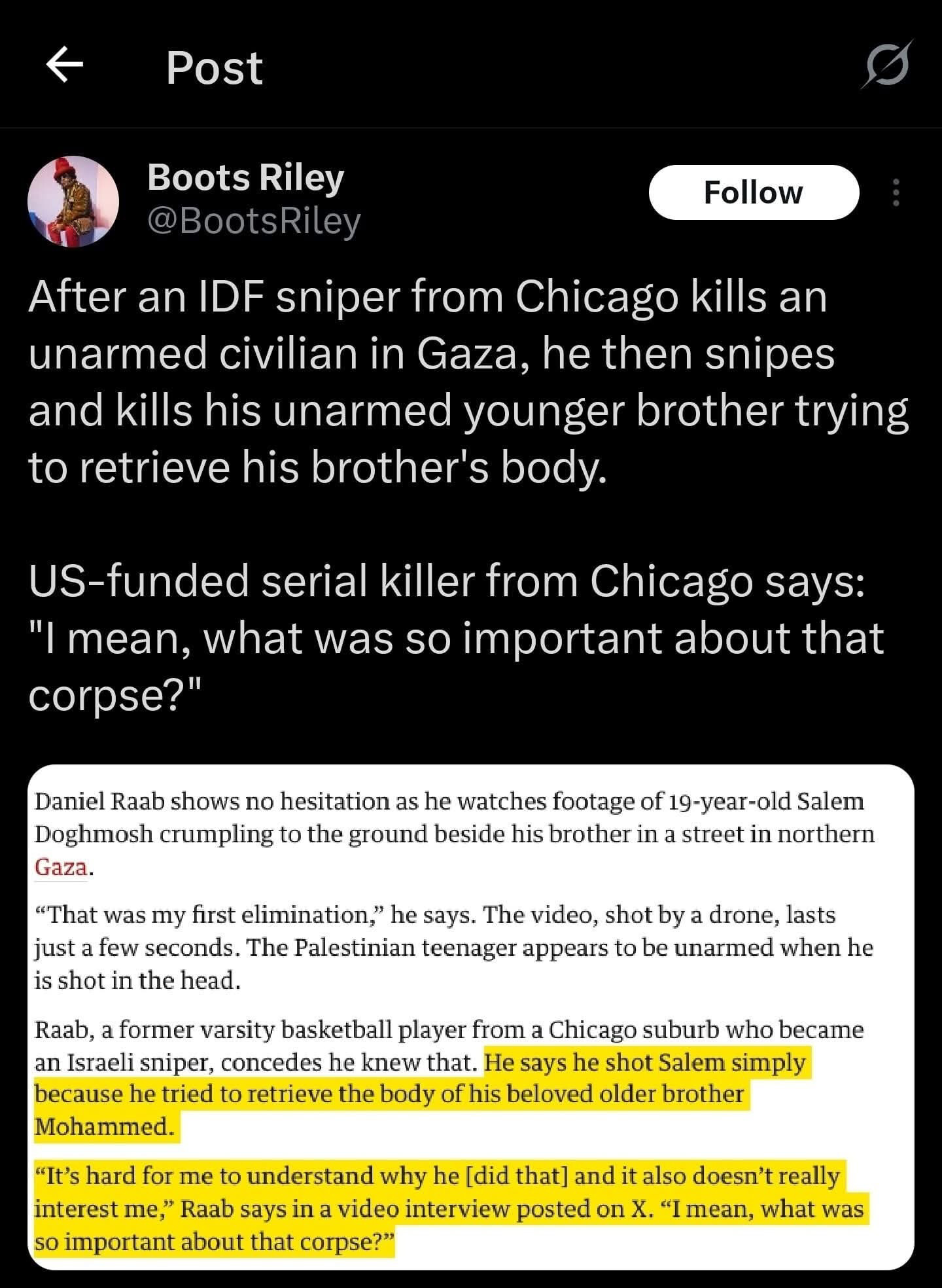 Hopefully this Daniel Raab gets his just desserts. I mean what so important about soulless inhuman IDF murderer?