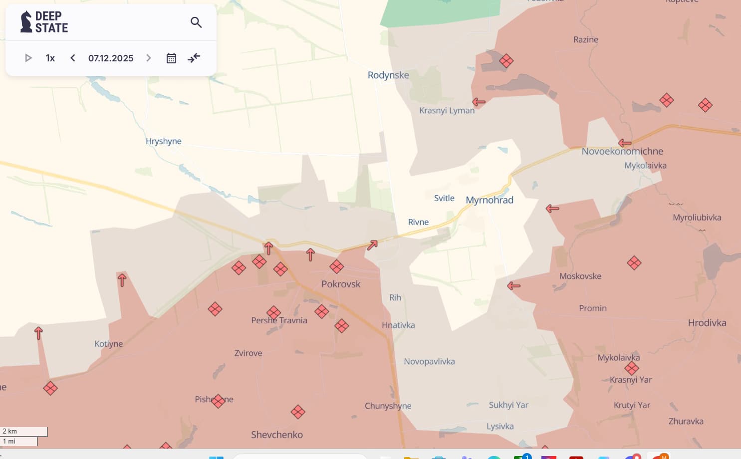 All of the grey is under Russian boots (Deepstate has long delay for Op Sec reasons), but general Syrksky still has not given the order to retreat from Myrnohrad. What I have been watching for months is crazy.