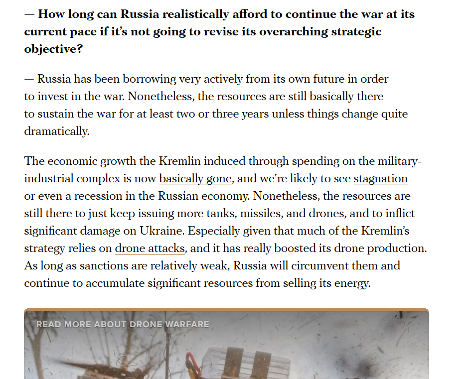 But in short, without very time consuming sourcing; I am pretty sure your source is wrong. Many researchers are in fact of the opinion that Russia cannot afford to stop the war and demobilise. Itâs has converted to War Economy, can absolutely afford to keep going at current pace into for another year at least (they recruit over 30-35k soldiers a month and have no problems getting enough recruits at current) . But it takes a lot of time to explain this properly. I would advise you to read the Meduza article I just posted, as it explains this some.