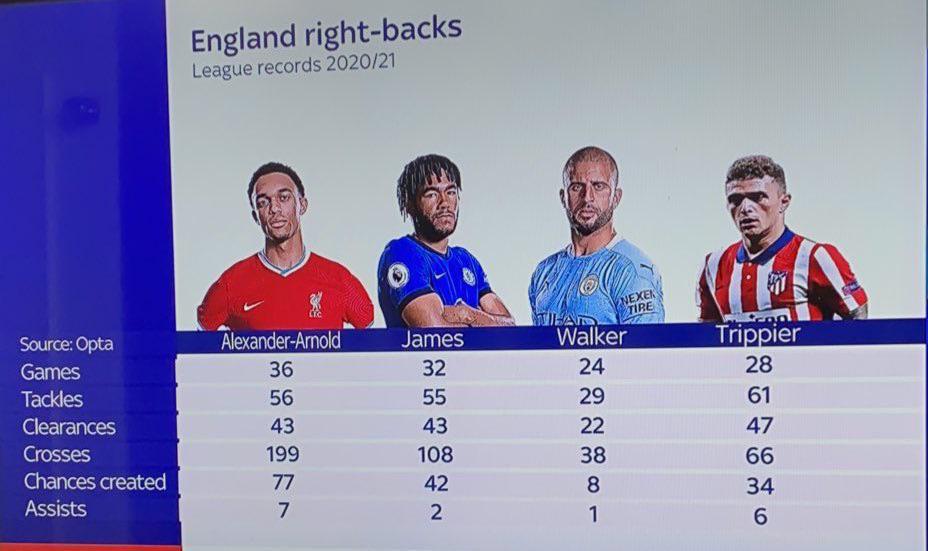 Trent is fantastic defensively. What people are making mistakes on is that INTENTIONALLY Trent is not always in the “solid” defensive positions that people expect him to be in because our team tactics require Trent to be in a different position with one of the CMs to take up the defensive tasks people expect Trent to be doing and therefore assess Trent as failing. James, Trippier and Walker are not better defensively than Trent. Walker plays in a more defensively structured set up which makes him look more “solid” and traditional. James and Trippier are awful defensively. That’s ignoring the offensive side of things. But if I had to choose a RB out of those 4 to go up against the top class wide players in international football, I’d pick Trent who has already dealt really well with those very same wingers.
