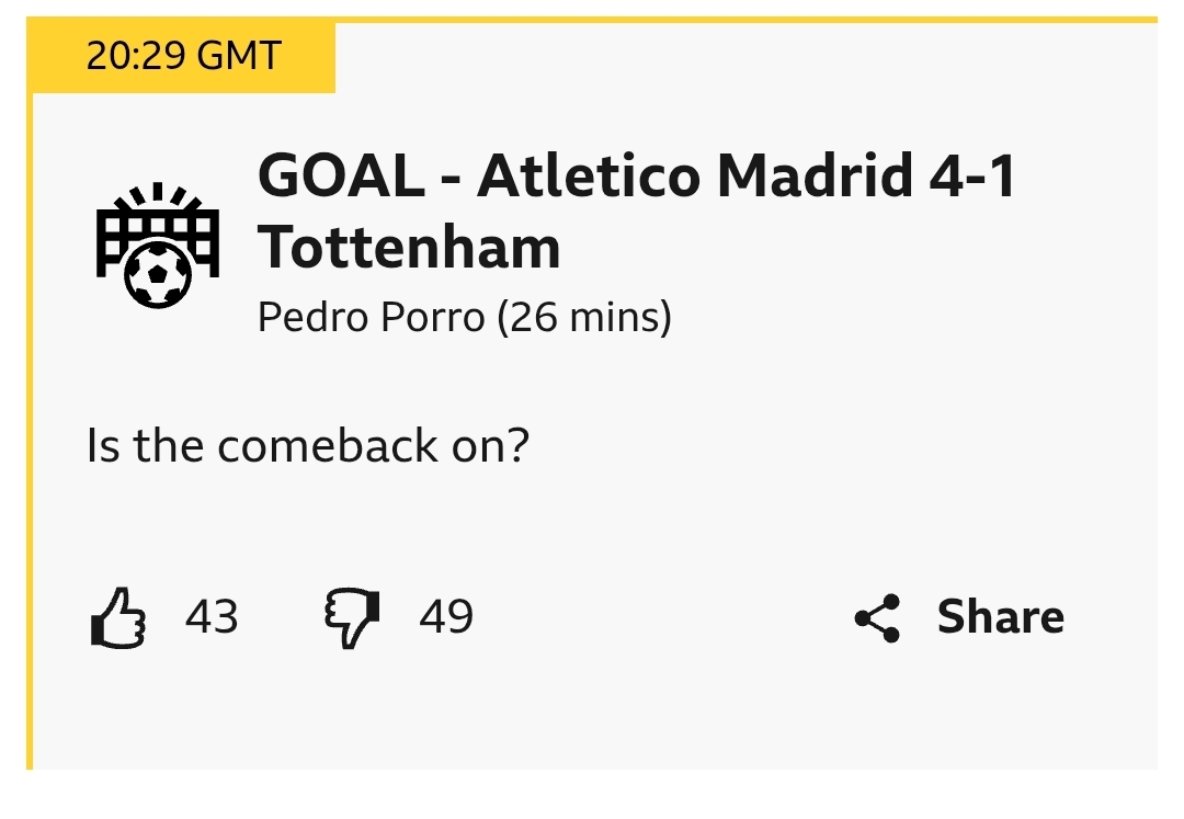 Spuds were already 0-3 behind against Atl Madrid in less than15 minutes. 3 Massive blunders by the Spuds keeper and the D.