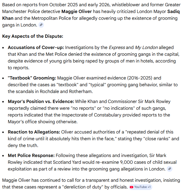 Looking at the AI responses to Maggie Oliver I can only see responses linking it to Rotherham style gangs from unreliable sources (including the likes of the BNP. These shouldn’t be included in summaries without specific warnings)