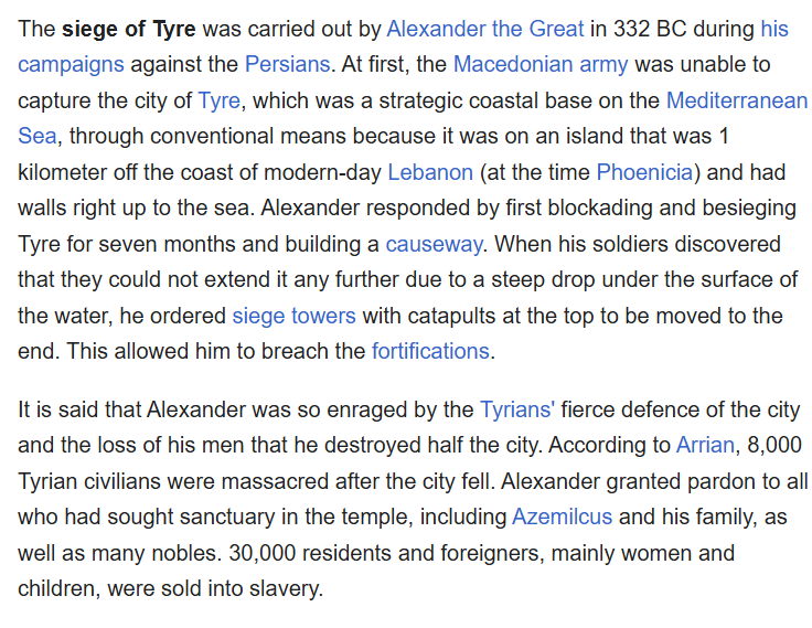Alexanderโs is the most famous because if I recall, the island had never been taken. His causeway resulted in the permanent isthmus that we still have today. Pretty incredible. Anyway, I suspect we digress. Can talk about this stuff for hours.
