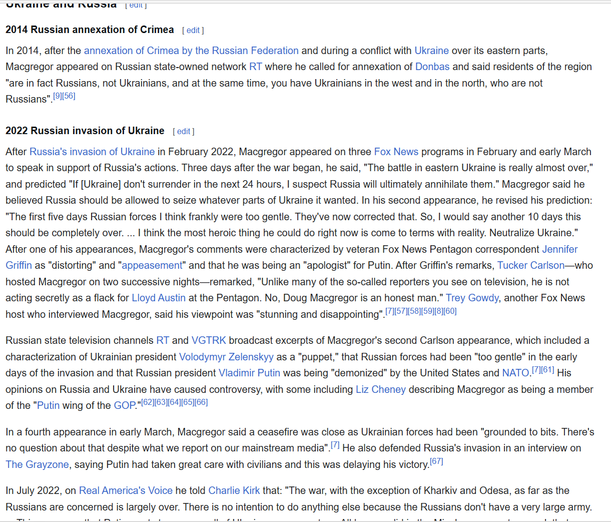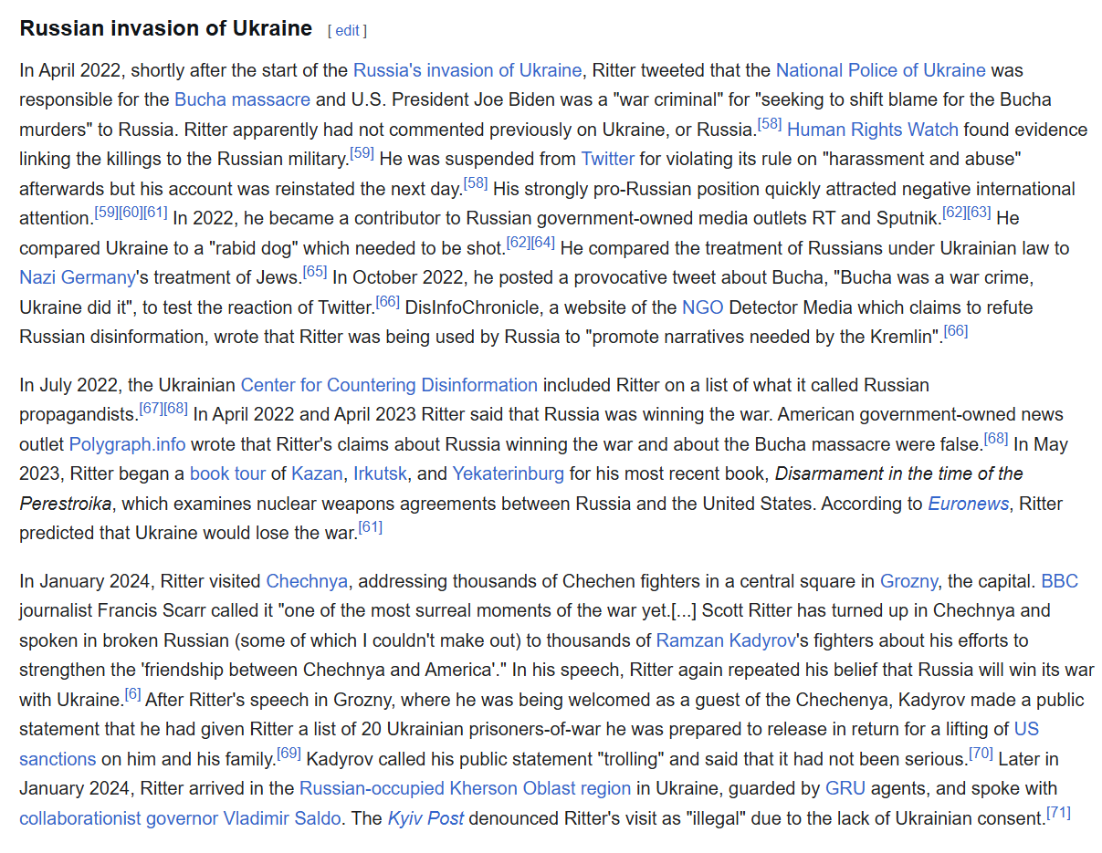 Mearsheimers absurd argument is that everything Russia does is self defence, Ritter spreads genocidal propanga, chem labs, nazi take over, all of it. They are associated with