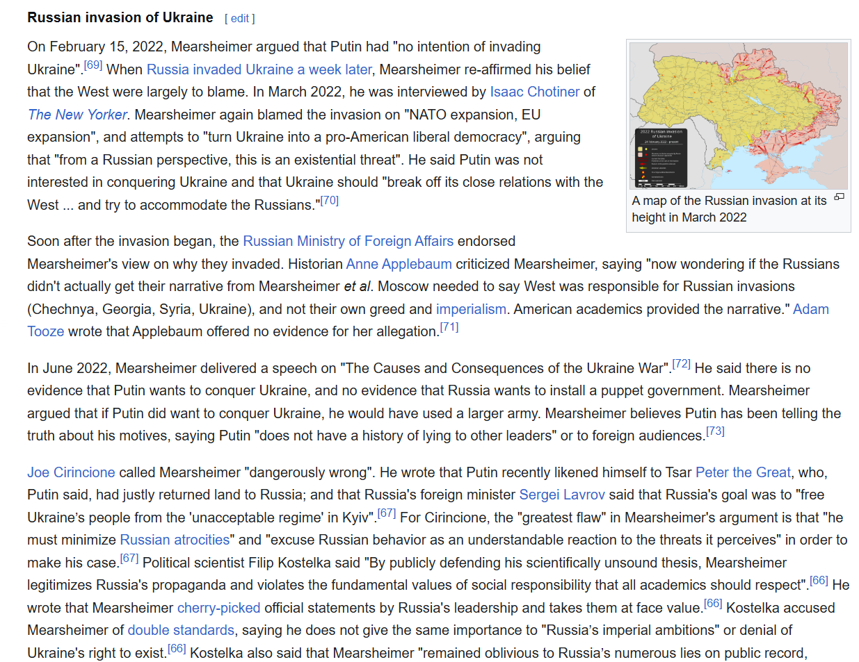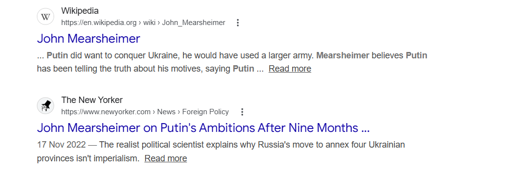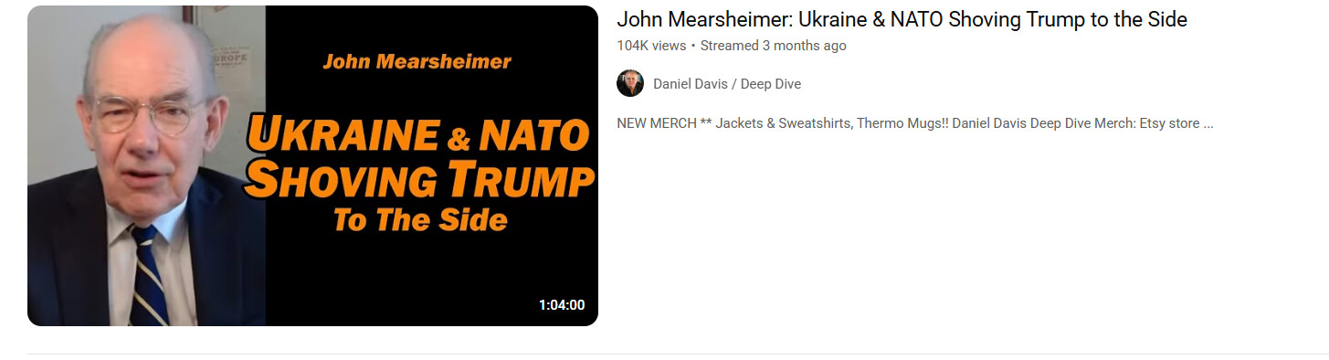 Mearsheimer is the most discredited Realist in the world and has been consistently wrong about absolutely everything througout the war. He is beyond ridiculous and willingly appears on shows with MAGA colonel (ret) Douglas McGegor (not only pro Russian, but an imbecile, his every analysis is wrong) and Hardcore Putinist and pedophile Scott Ritter .